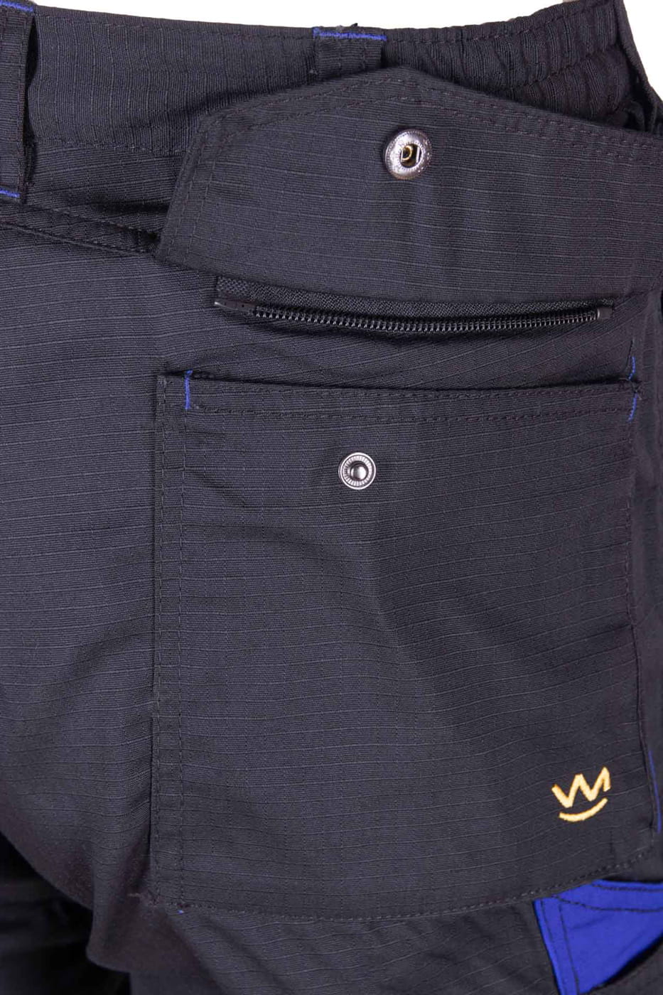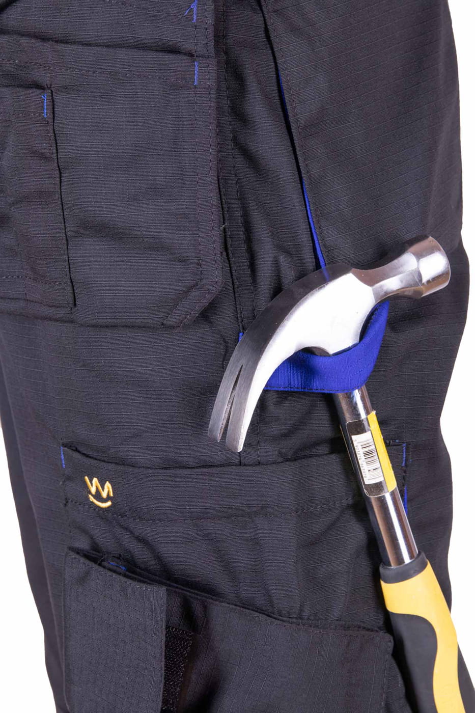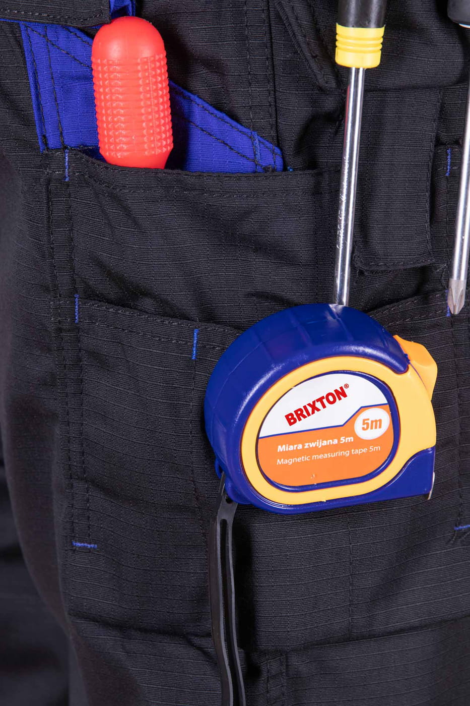 - kieszenie: dwie kieszenie w tylnej części spodni, dwie kieszenie boczne, wzmocnione kieszenie zapinane na rzepy, kieszeń na komórkę, kieszeń na miarkę „metrówkę”,ergonomiczna kieszeń na nakolanniki i dwie kieszenie monterskie dopinane na zamek