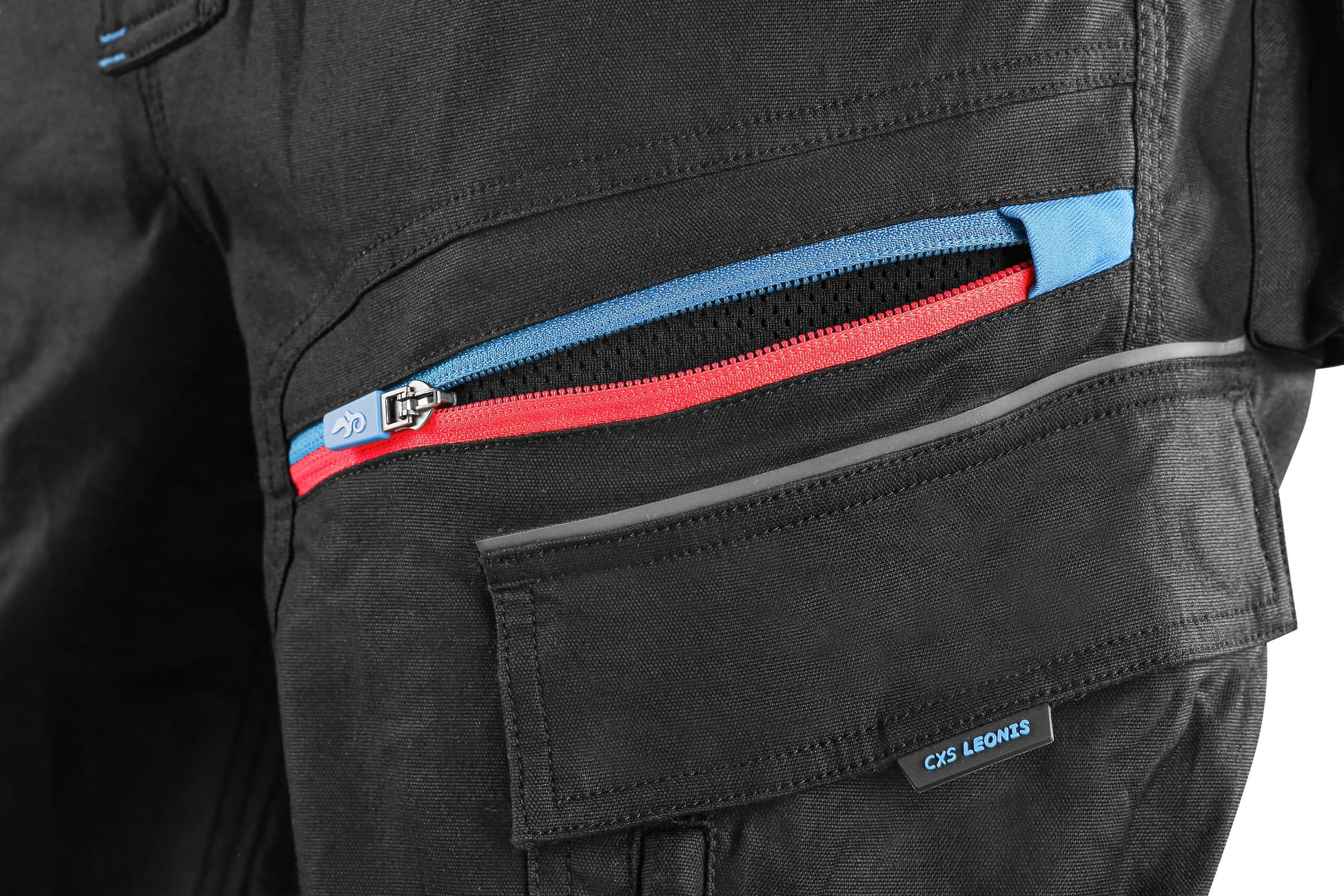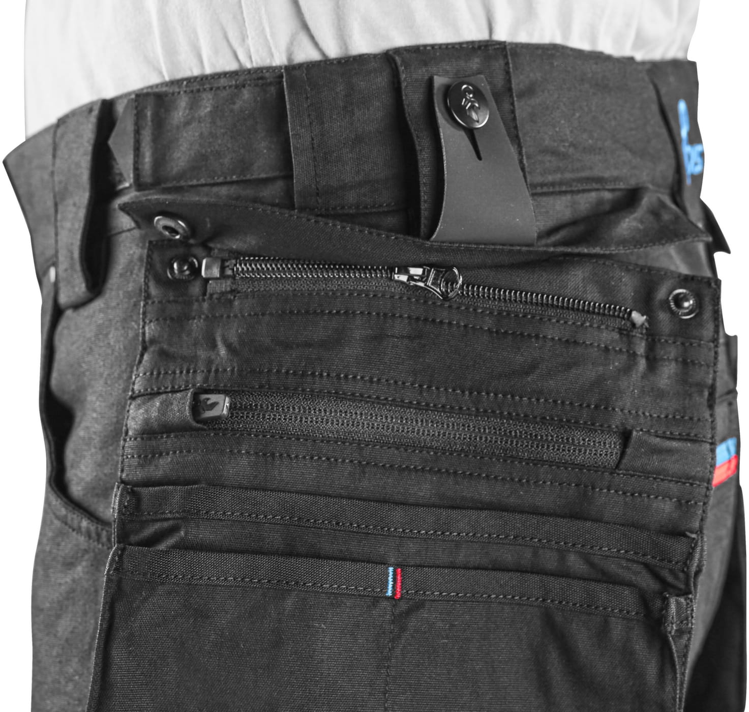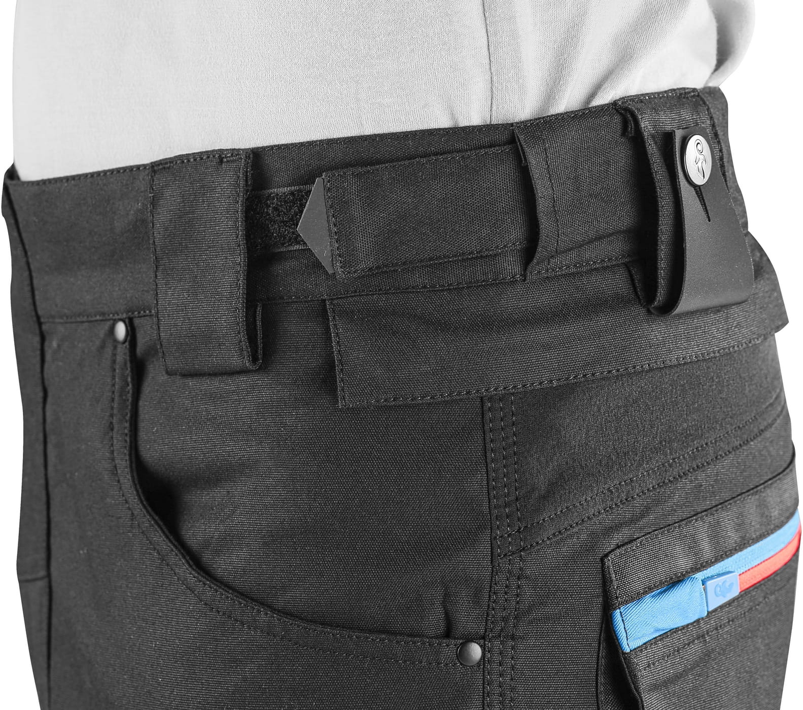 - kieszenie: dwie kieszenie z przodu, dwie odpinane kieszenie na narzędzia wzmocnione materiałem Corudra®, kieszenie na udach na zamek z możliwością wentylacji i kieszenią na kartę ID, kieszeń z boku z dodatkową kieszenią na zamek, dwie tylne kieszenie wzmocnione materiałem Corudra® (w tym jedna na zamek) i kieszeń na metr składany z dalszymi przegródkami