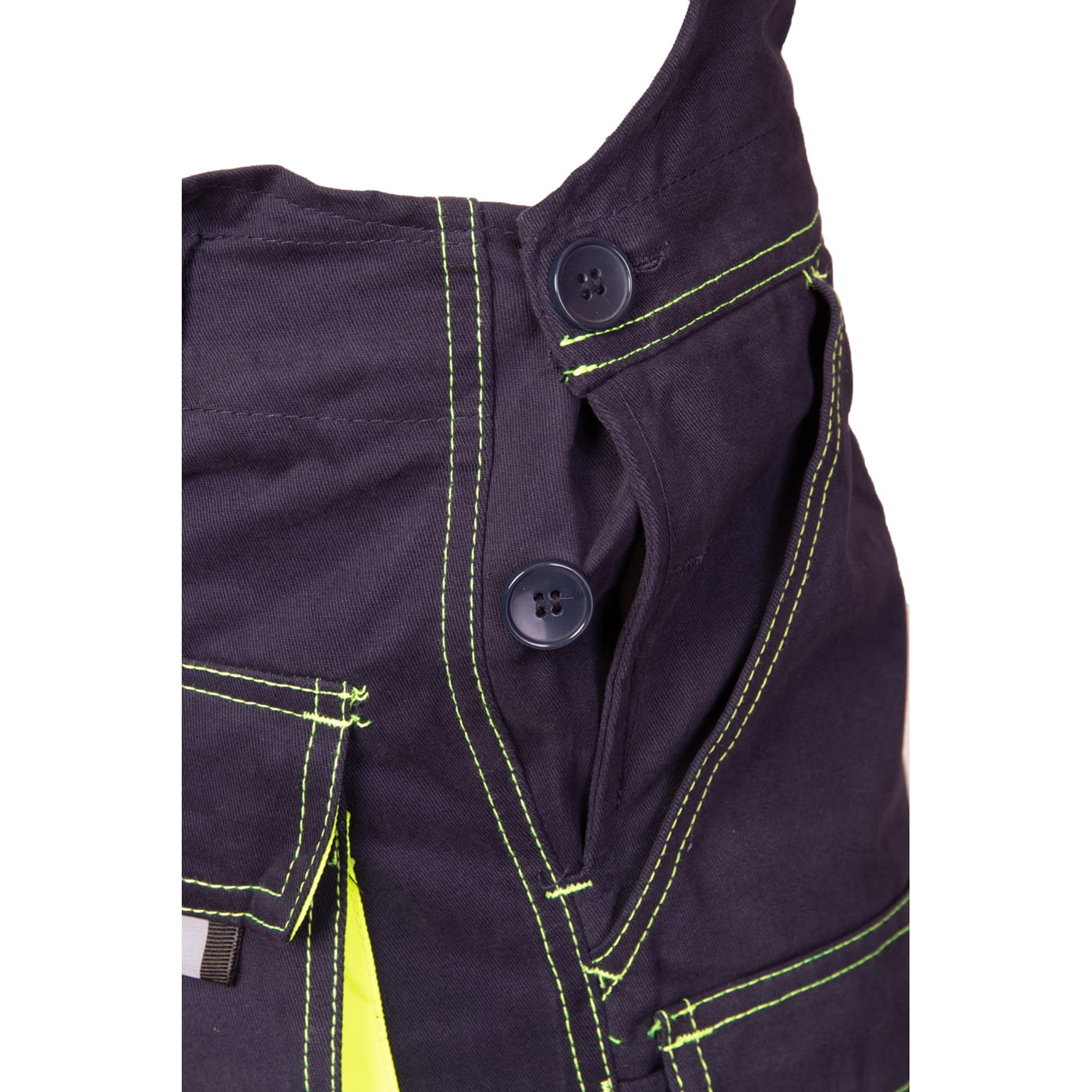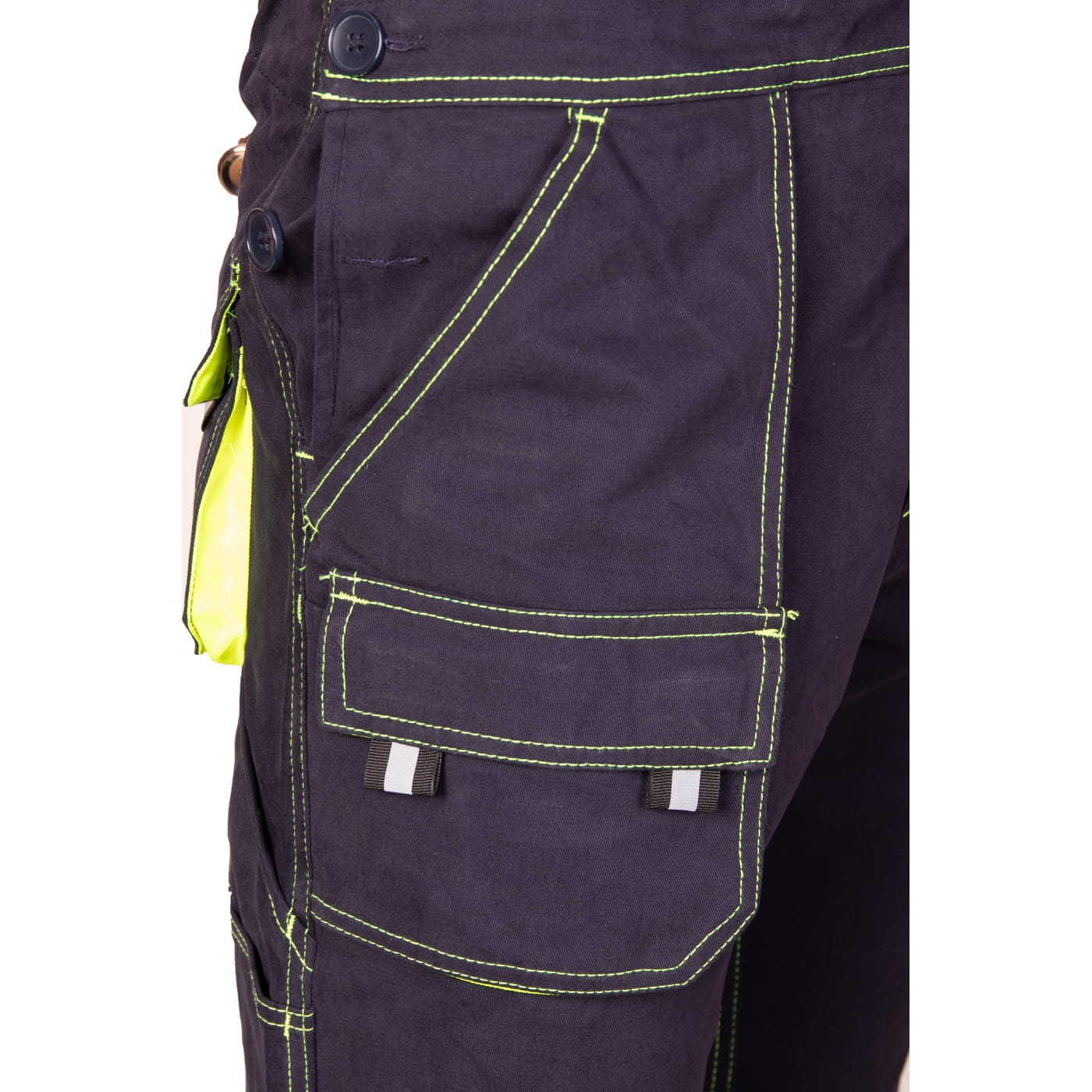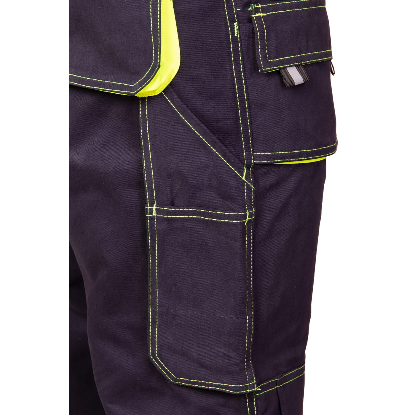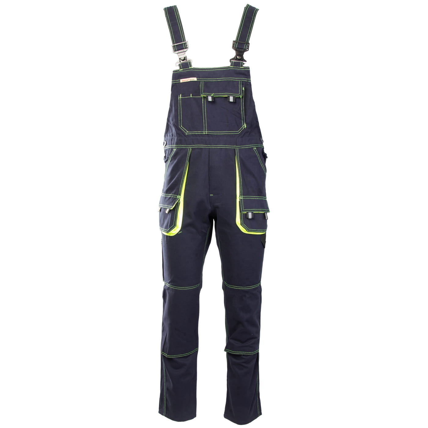 - kieszenie: przestrzenne kieszenie, dwie kieszenie boczne, wzmocnione kieszenie zapinane na rzepy, kieszeń na komórkę, dwie kieszonki na długopisy, kieszeń na dokumenty, kieszeń na miarkę i ergonomiczna kieszeń na nakolanniki