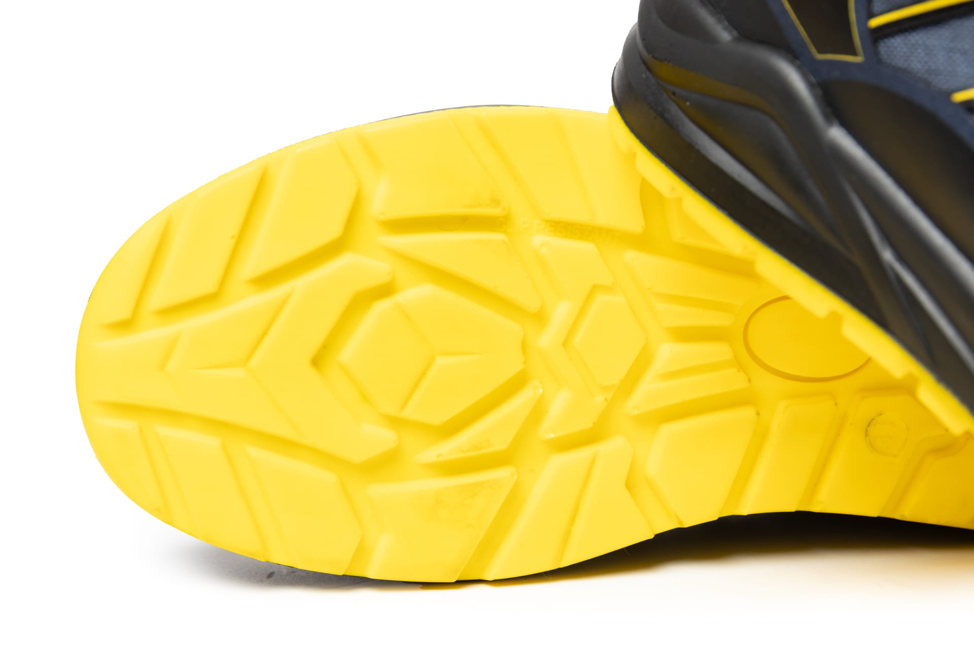 - podeszwa PU/PU z kolorową wstawką TPU, wtryskiwana, o podwójnej gęstości; odporna na węglowodory, olejoodporna, antyelektrostatyczna, posiadająca właściwości antypoślizgowe SRC
