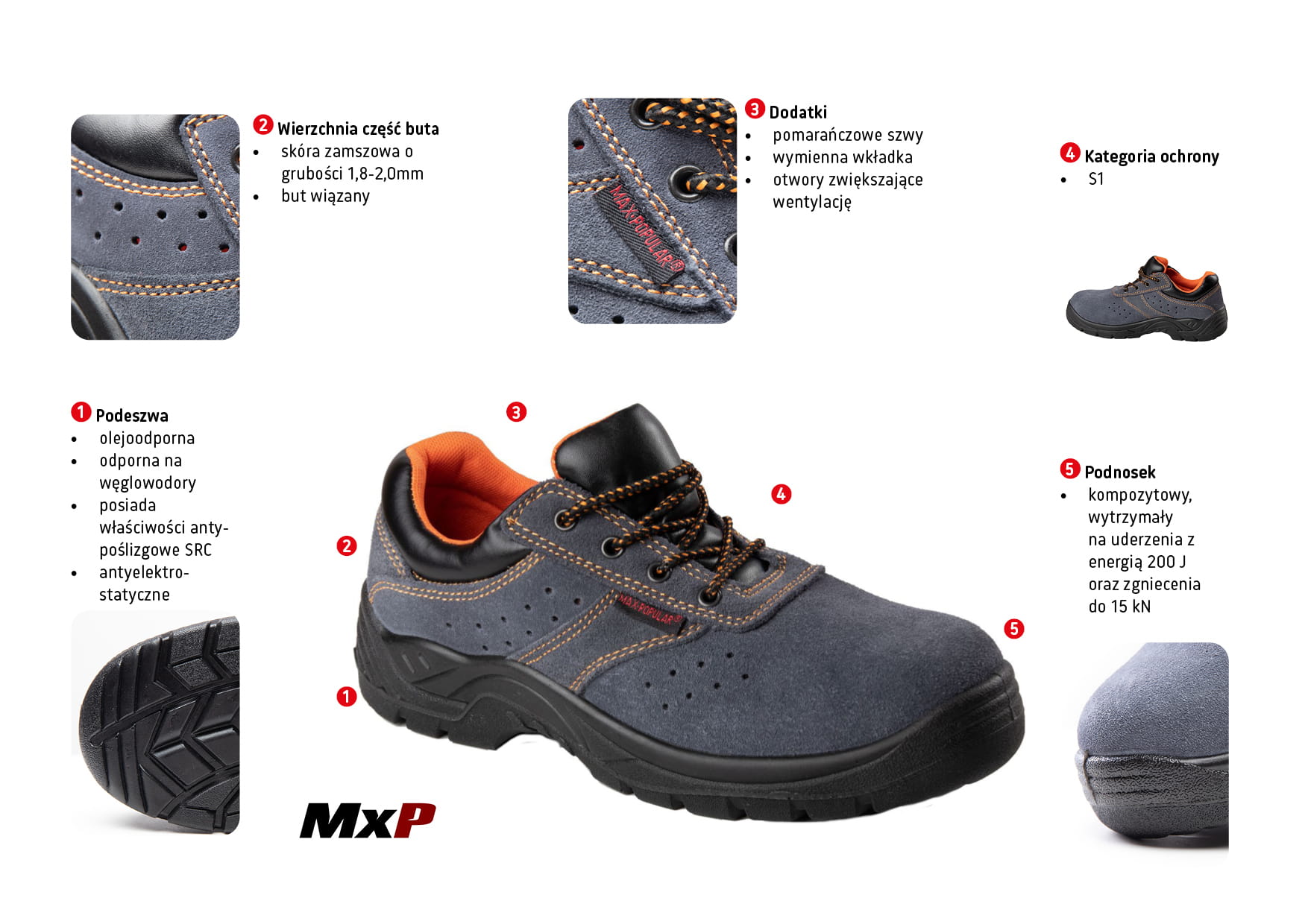 - metalowy podnosek, wytrzymały na uderzenia z energią 200 J oraz zgniecenia do 15 kN
