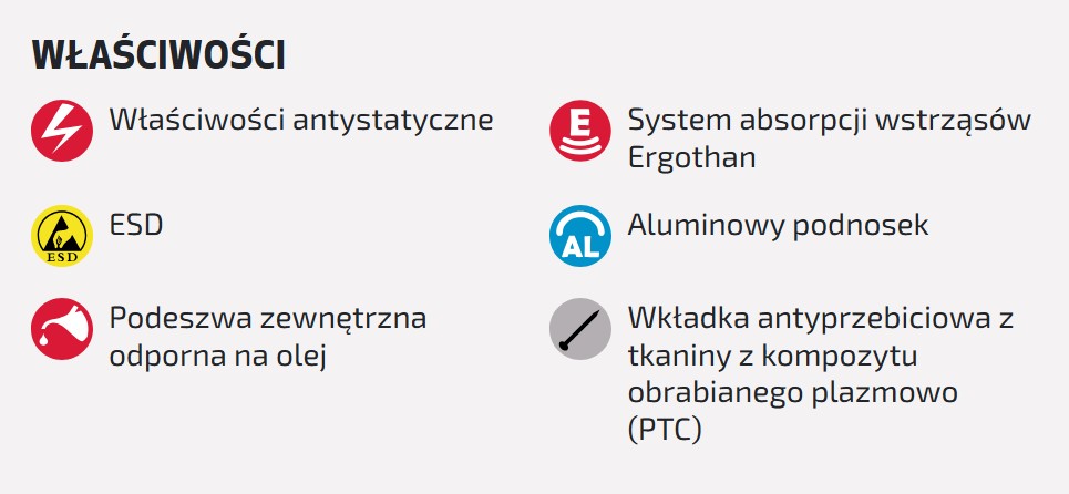 - cholewka ze skóry powlekanej poliuretanem i dwoiny zapewnia stopom stabilizację, podparcie i zabezpieczenie antystatyczne