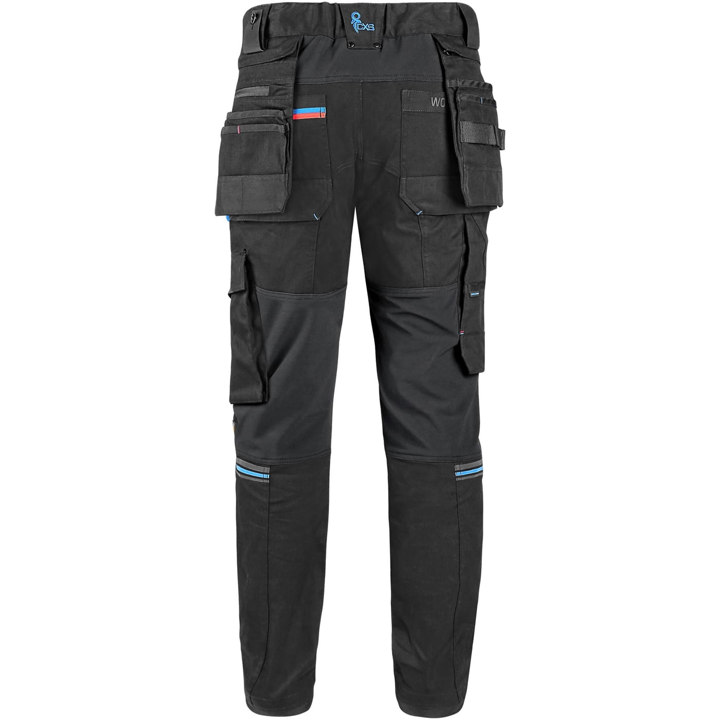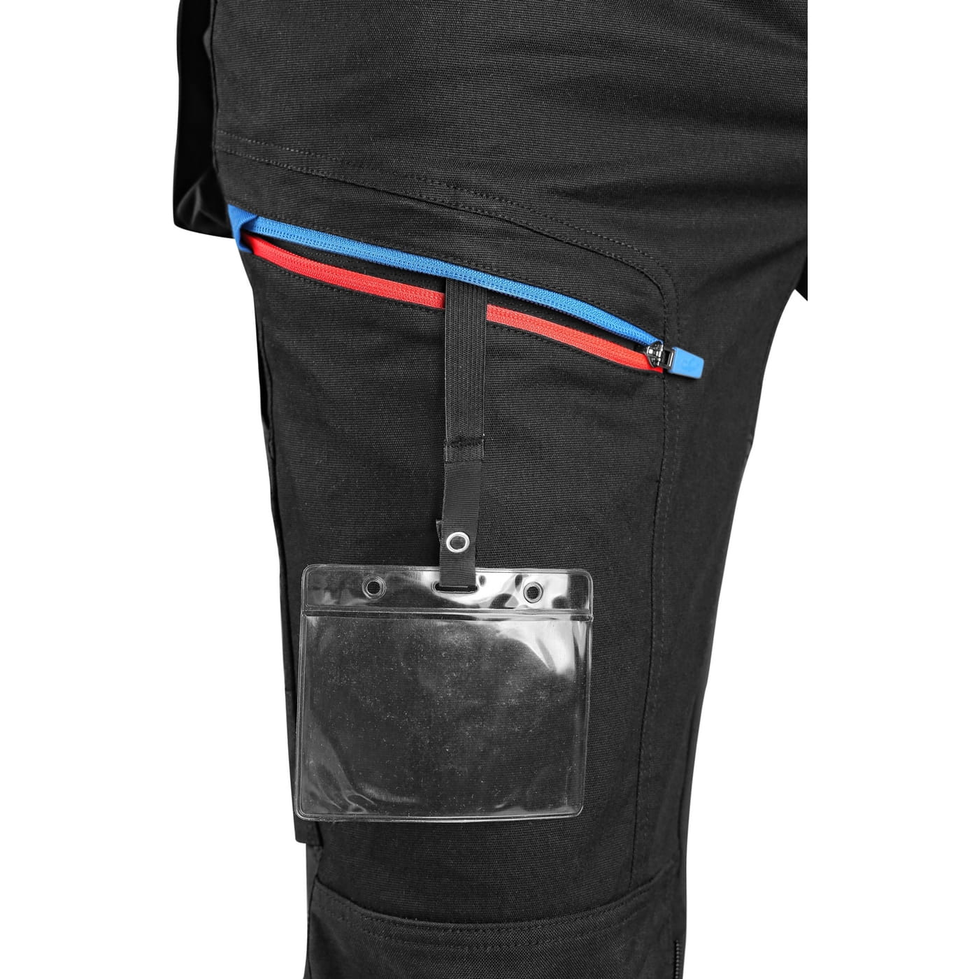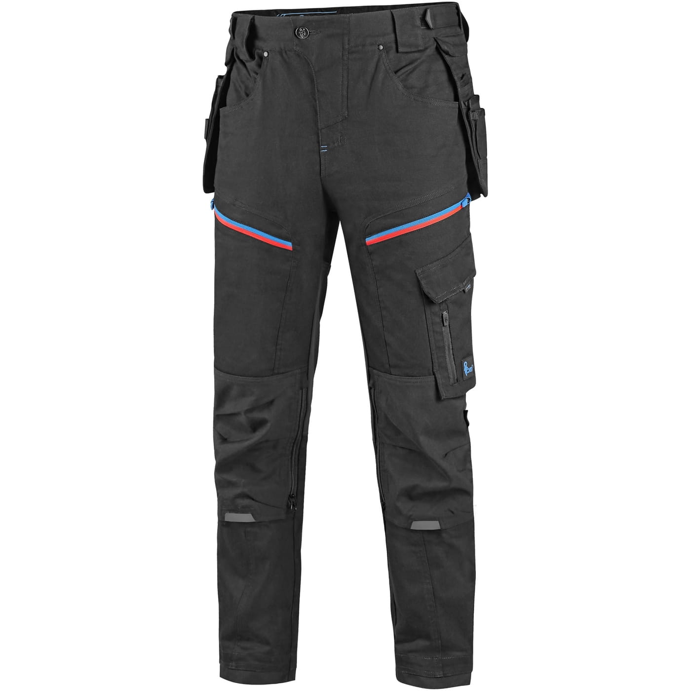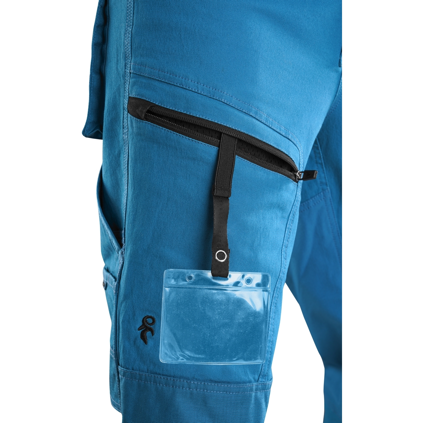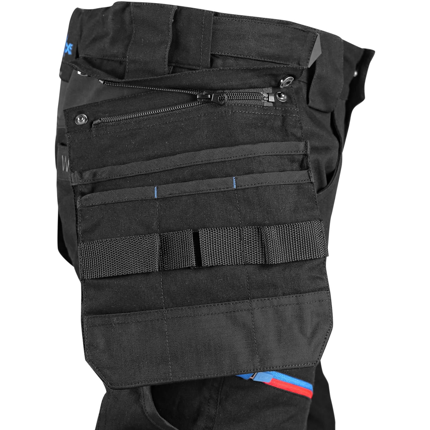 - kieszenie: dwie kieszenie z przodu, dwie odpinane kieszenie na narzędzia wzmocnione materiałem Cordura®, kieszenie na udach na zamek z możliwością wentylacji, kieszeń z boku z dodatkową kieszonką na zamek, dwie tylne kieszenie (jedna na zamek) wzmocnione materiałem Cordura®, kieszeń na metr składany z dalszymi przegródkami oraz kieszonka na kartę ID