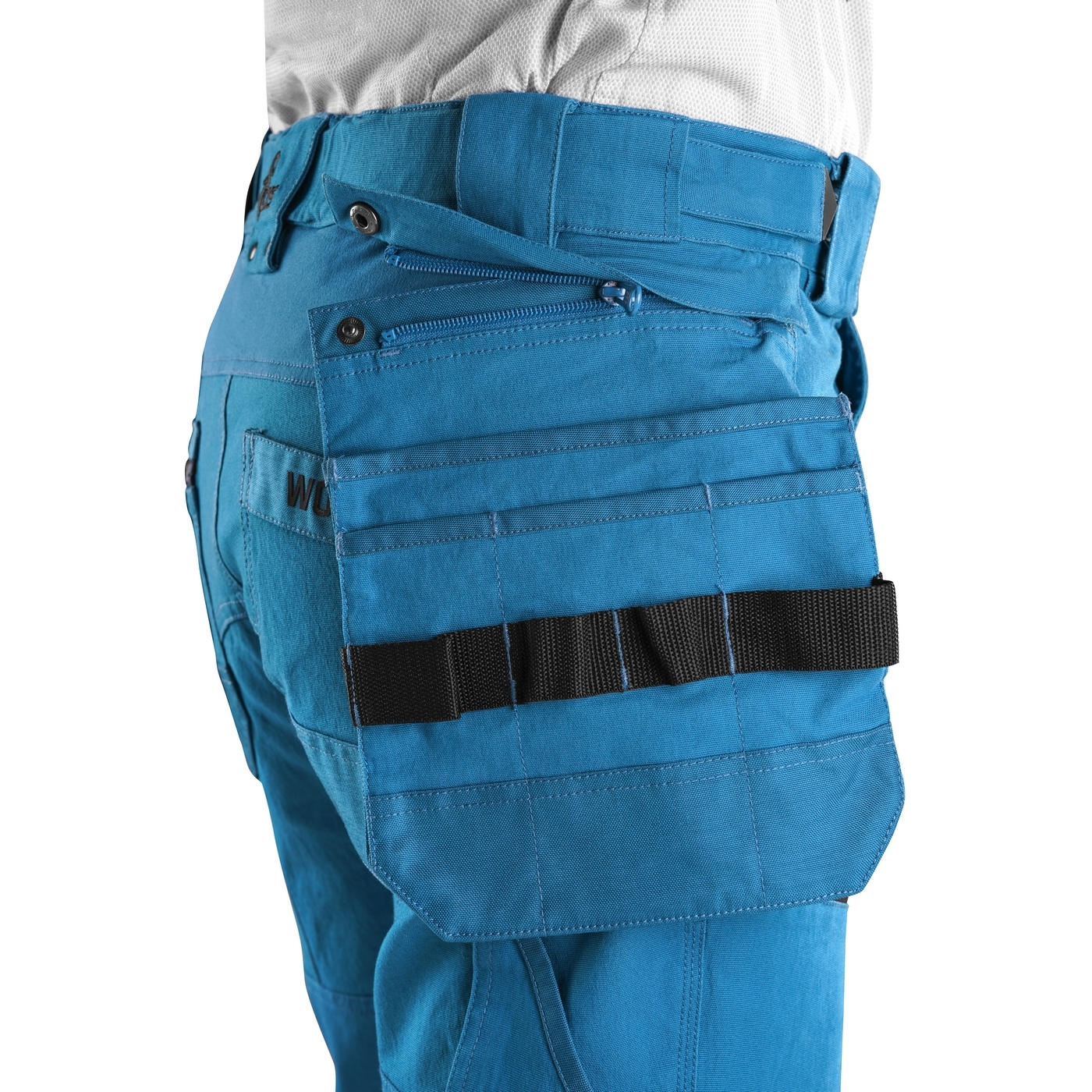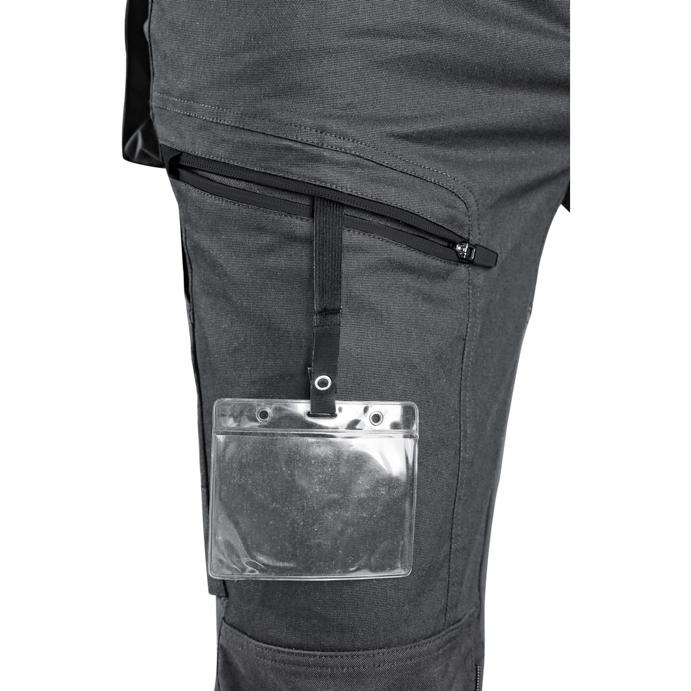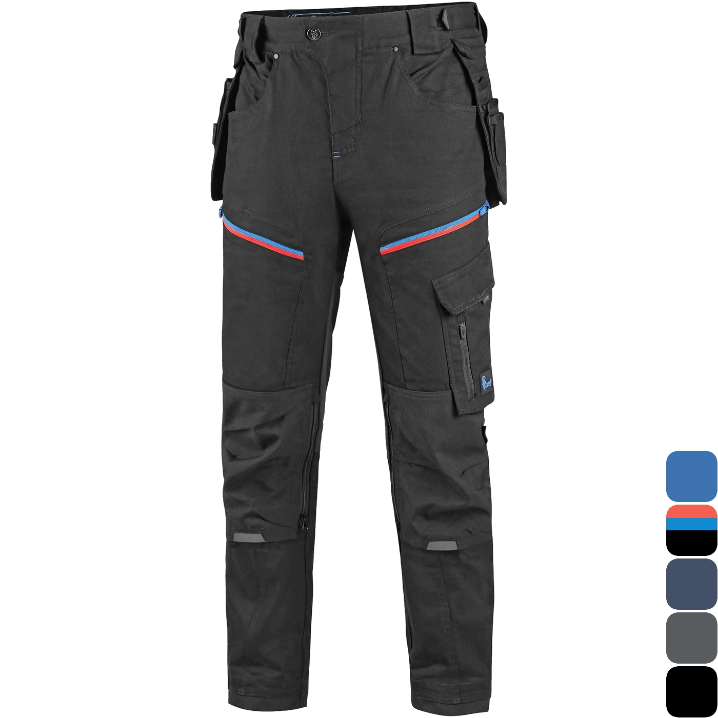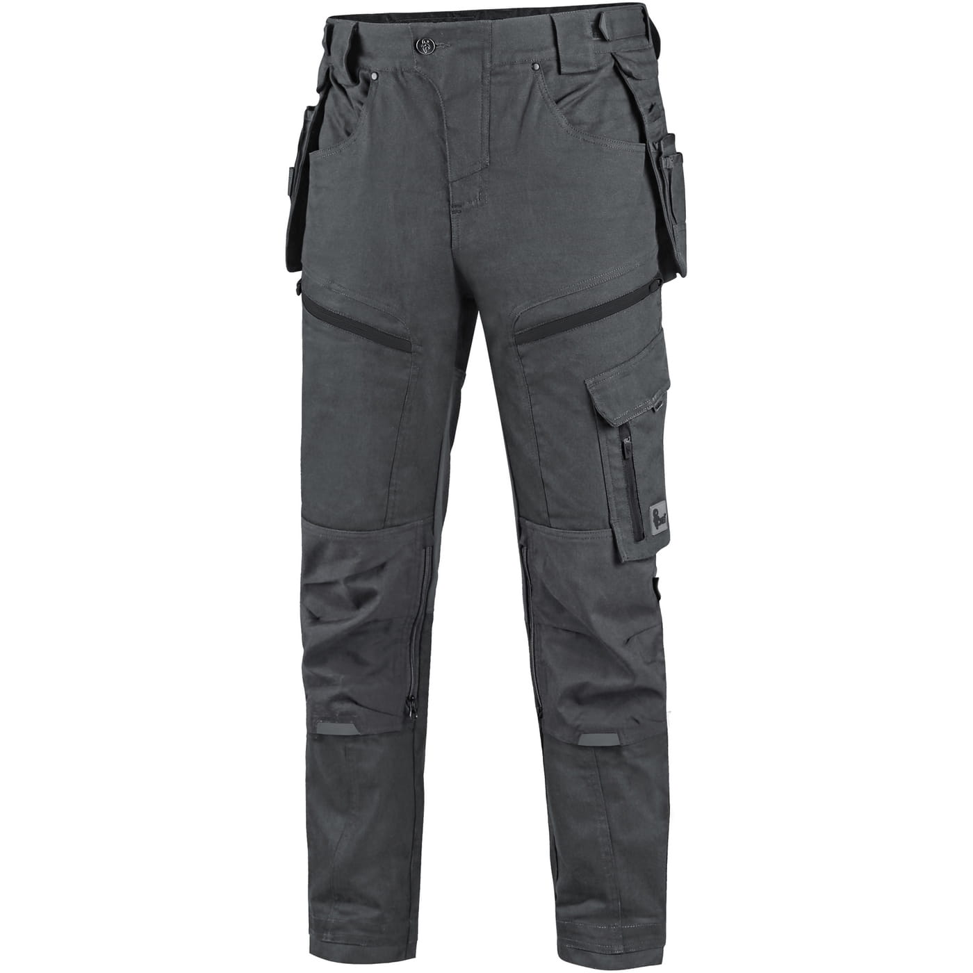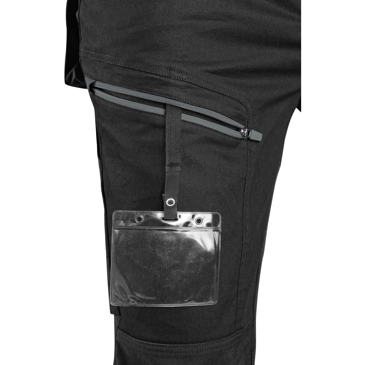 - kieszenie: dwie kieszenie z przodu, dwie odpinane kieszenie na narzędzia wzmocnione materiałem Cordura®, kieszenie na udach na zamek z możliwością wentylacji, kieszeń z boku z dodatkową kieszonką na zamek, dwie tylne kieszenie (jedna na zamek) wzmocnione materiałem Cordura®, kieszeń na metr składany z dalszymi przegródkami oraz kieszonka na kartę ID