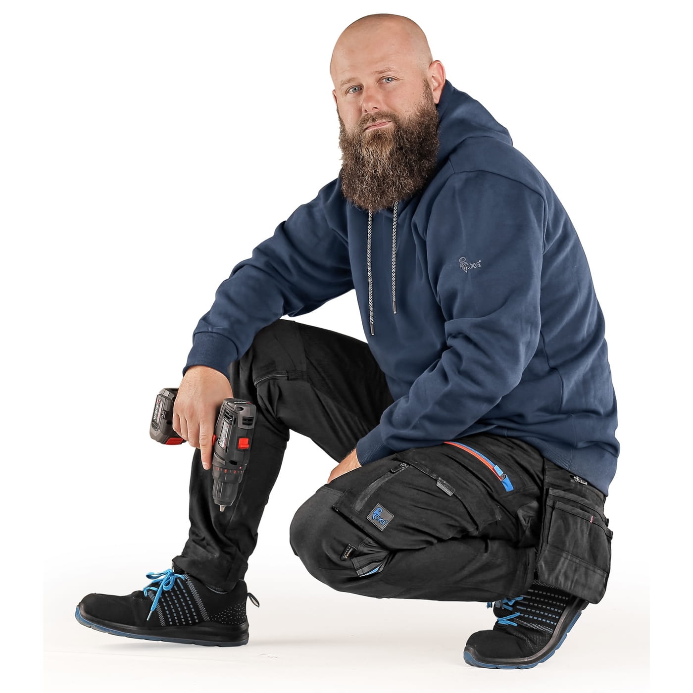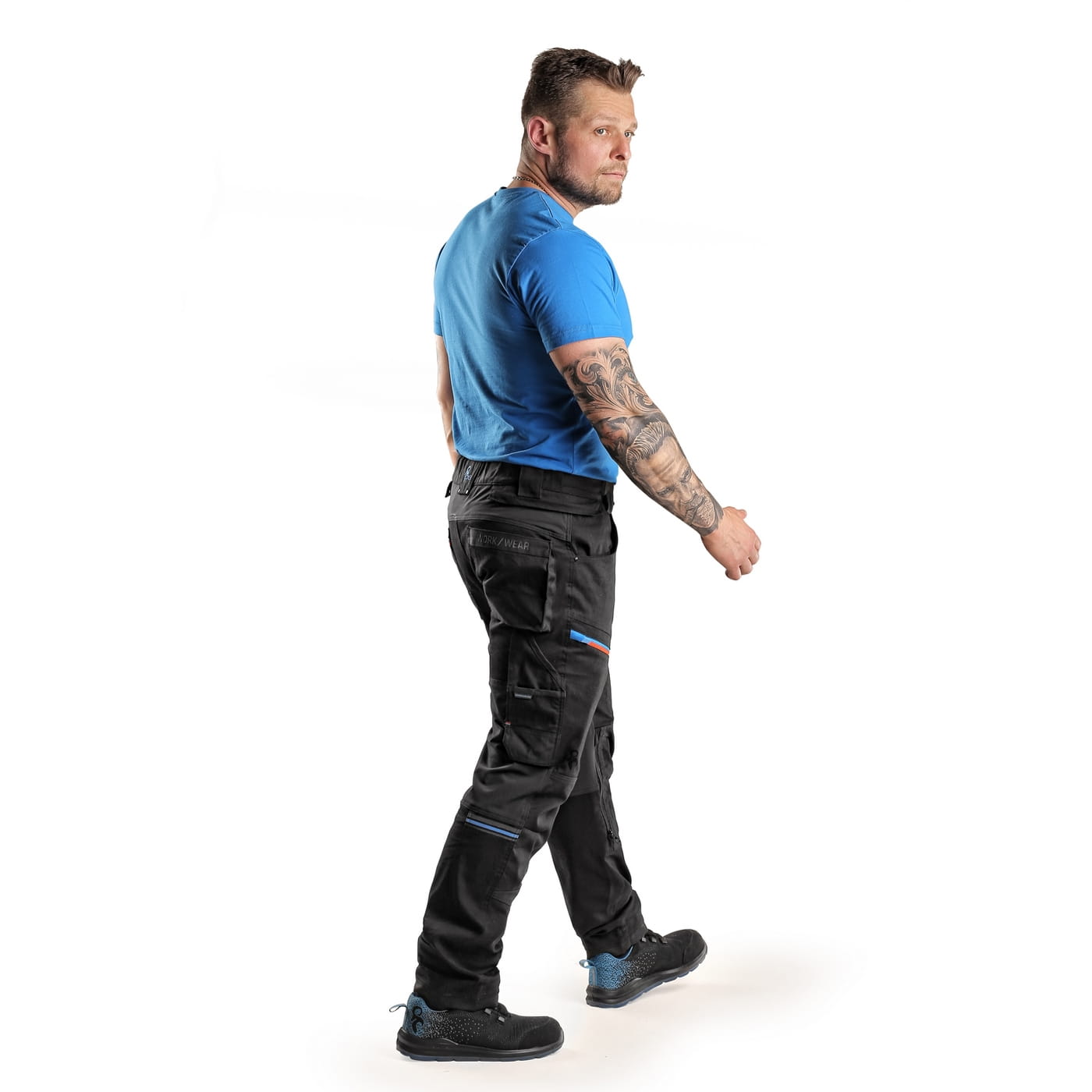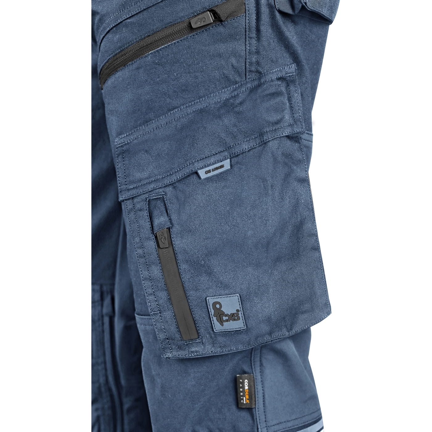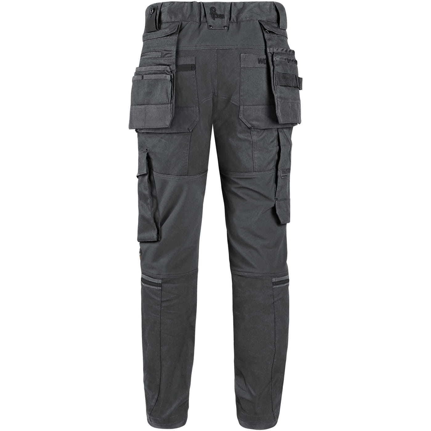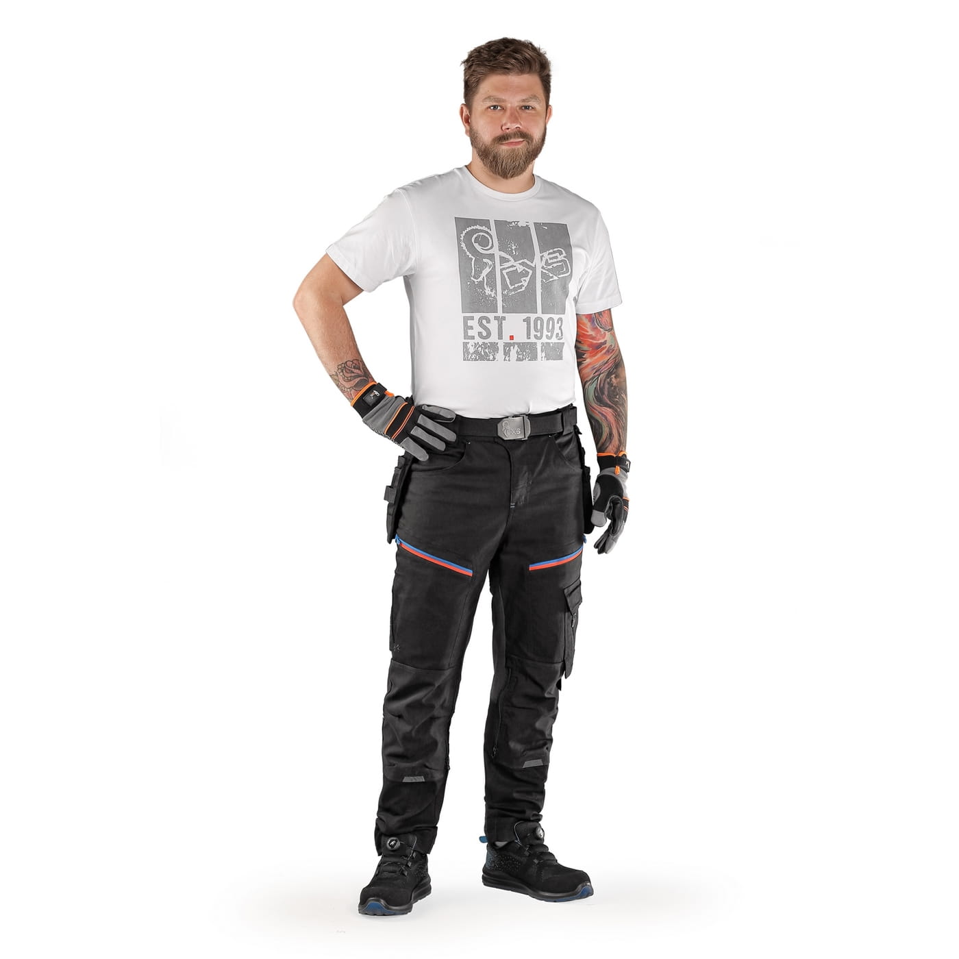- kieszenie: dwie kieszenie z przodu, dwie odpinane kieszenie na narzędzia wzmocnione materiałem Cordura®, kieszenie na udach na zamek z możliwością wentylacji, kieszeń z boku z dodatkową kieszonką na zamek, dwie tylne kieszenie (jedna na zamek) wzmocnione materiałem Cordura®, kieszeń na metr składany z dalszymi przegródkami oraz kieszonka na kartę ID