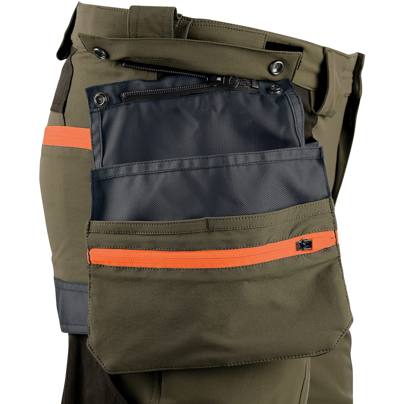 - duża ilość praktycznych kieszeni: dwie przednie kieszenie, dwie odpinane kieszenie na narzędzia wzmocnione materiałem Cordura, kieszeń na suwak na udzie, wielofunkcyjna kieszeń boczna, dwie tylne kieszenie na dole wzmocnione materiałem Cordura