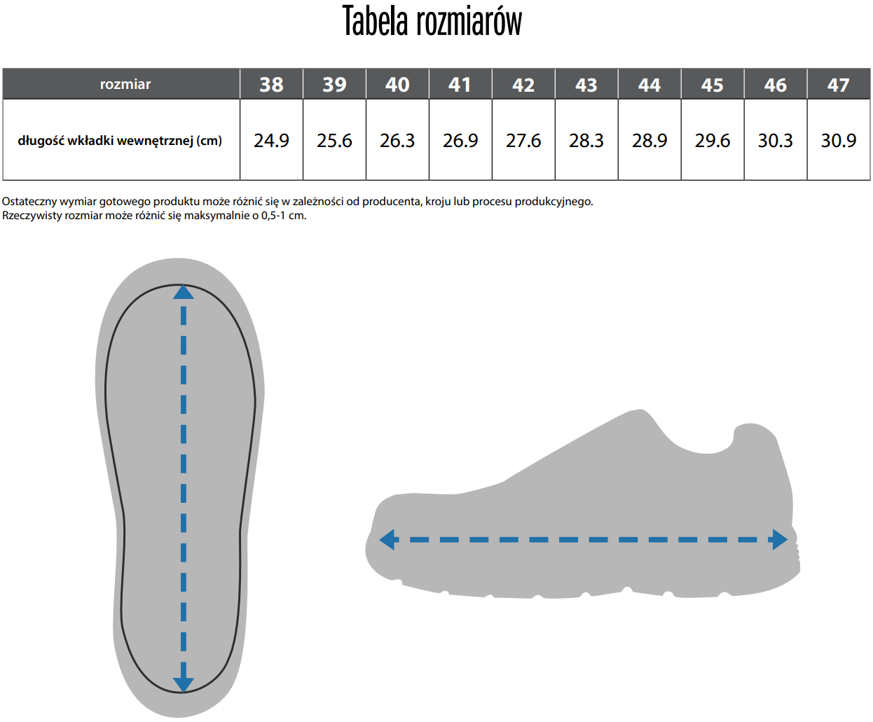 - podszewka oddychająca tkanina o dobrych właściwościach absorpcyjnych, wewnętrzna pięta z PU wzmocnieniem